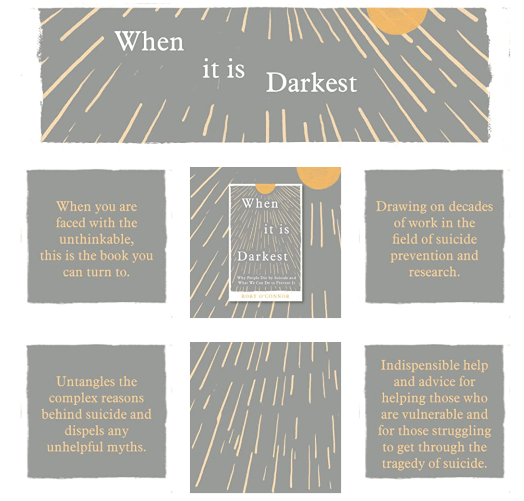 “I read ‘When it is Darkest’ in a single sitting. What makes it so compelling is its unique combination of research, clinical, and deeply personal perspectives on one of the great societal challenges of our time. Rory’s enthusiasm to make things better and his utter dedication to suicide prevention shines through. He debunks myths, challenges perceptions (including my own), and shares his profound understanding of the tragedy of suicide. Cutting edge research is described in an accessible and engaging way and is complemented wonderfully by the clinical stories throughout the book. There is also a wealth of practical advice on everything from asking about suicide, to supporting those who are suicidal, to drawing up safety plans to keep people safe. This is a really important book for those who are suffering with suicidal thoughts, those who have been bereaved by suicide, and the family, friends, and professional who want to help them”