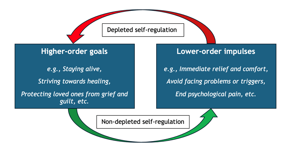 Individuals at risk of suicide may experience stronger desires and more unresolved inner conflicts than those who are not suicidal, often due to accumulating emotional distress and a significant discrepancy between their current reality and personal standards. Managing this inner conflict requires a lot of self-regulatory effort, which can leave individuals feeling mentally exhausted. When mental resources are diminished, the self-regulation process can reverse, allowing lower-order impulses to override higher-order goals (see illustration below). This phenomenon represents a failure of Transcendence – the inability to focus or divert attention beyond immediate stimuli – which is a proximal cause of self-regulation failure. This state closely resembles the “tunnel vision” commonly observed in suicidal individuals, characterised by a narrowing thought process evoked by feelings of entrapment and hopelessness.