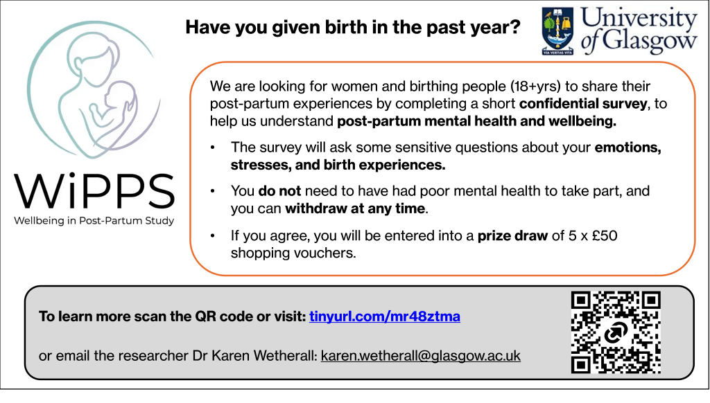 We are looking to hear from women and birthing people who are aged 18 years and over and who have given birth within the last year to share their post-partum experiences. You can participate in this study whether or not you have had poor mental health or not.